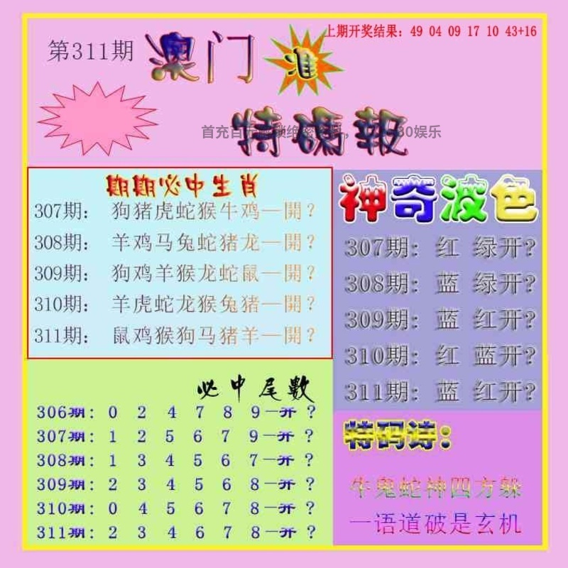 | 307期四肖 | 羊猴狗鼠 | 开:狗20 |